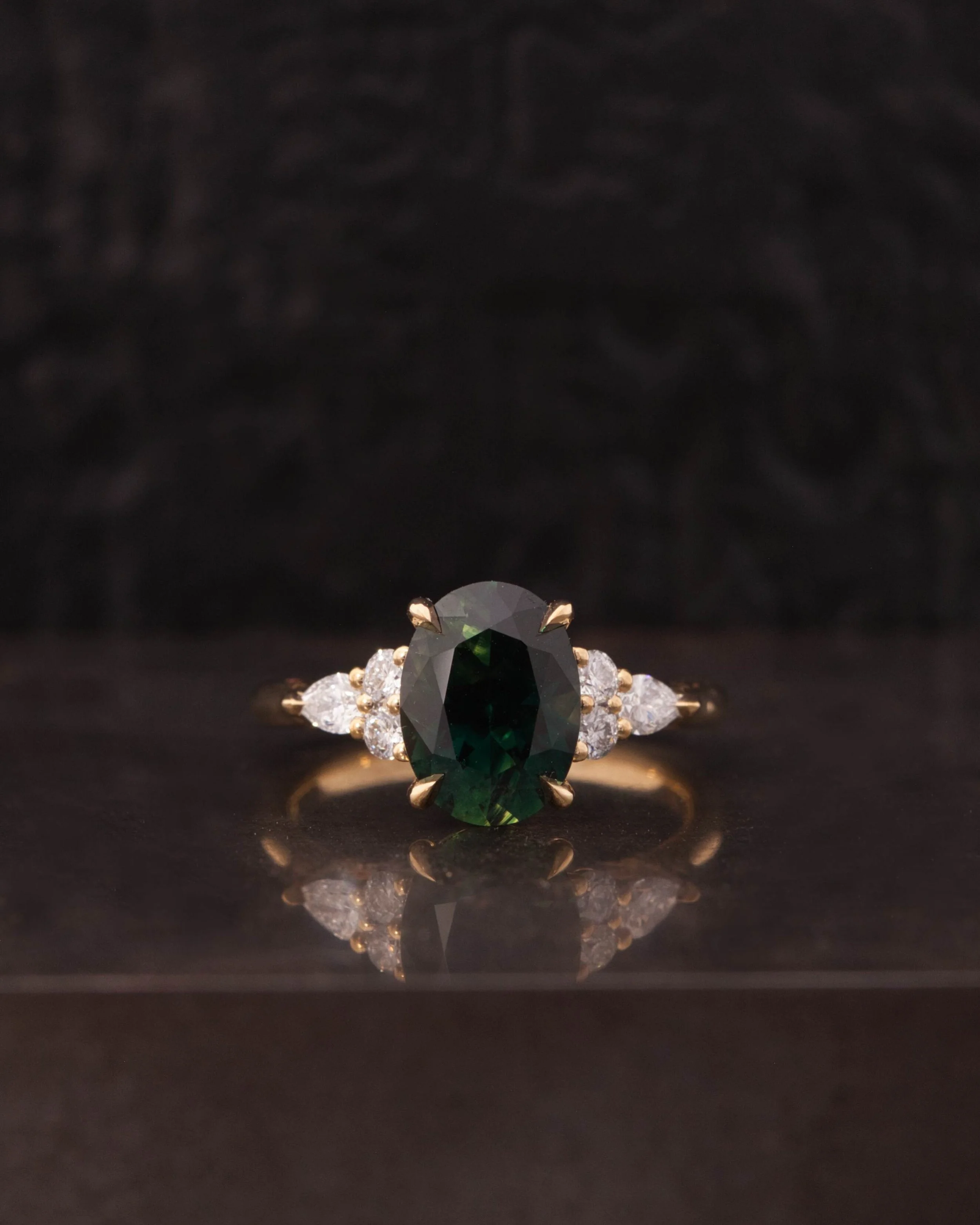 3.11ct Queensland green blue coloured oval sapphire with DE VVS quality lab grown pear and round shape side diamonds made in 18ct yellow gold.
